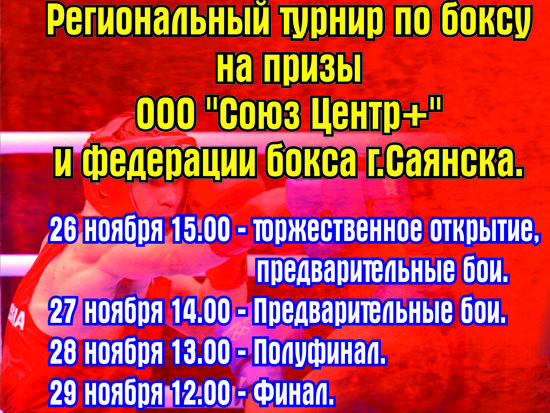 Уважаемые любители спорта и жители нашего города, приглашаем вас на региональные соревнования по боксу на призы ООО "Союз Центр+" и федерации бокса города Саянска.