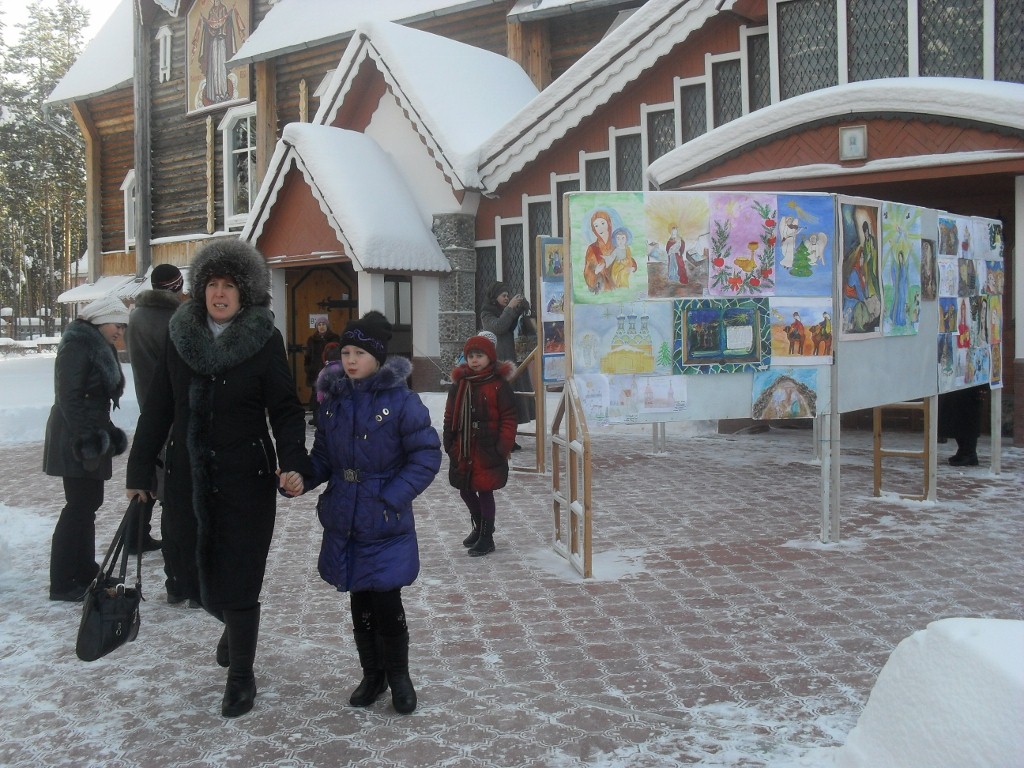 Объявление итогов конкурса состоялось 8 января в Благовещенском Храме. Около часа дня дорога к Храму заполнилась ребятней, их родителями и педагогами. Дети с интересом рассматривали устроенную у ворот церкви художественную композицию, представляющую сценку Рождества Христова. А у входа в Храм изображение евангельской истории можно было увидеть на выставке конкурсных рисунков. На стендах - лучшие работы дошкольников, учеников школ, воспитанников Дома детского творчества, художественной школы и социальных учреждений города...