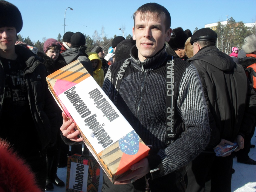 Народ веселился, радуясь выходному дню и пригревшему солнцу. Многие прихлёбывали пивко, и, разгорячившись, с азартом участвовали в конкурсах и пытались штурмовать смазанный глицерином столб с призами. Для любителей пива призы оказались недосягаемыми. Класс верхолазания показал 30-летний Владимир Лещенко, поднявшийся на верхушку столба с завидной лёгкостью. Как оказалось, Владимир – спортсмен: катается на сноуборде, упражняется с гирями и штангой. До него на заветной вершине побывали ещё два добра молодца: сняли лодку и пылесос. Владимир выбирал между одеялом и продукцией «Саянского бройлера».