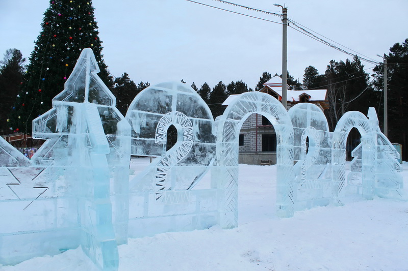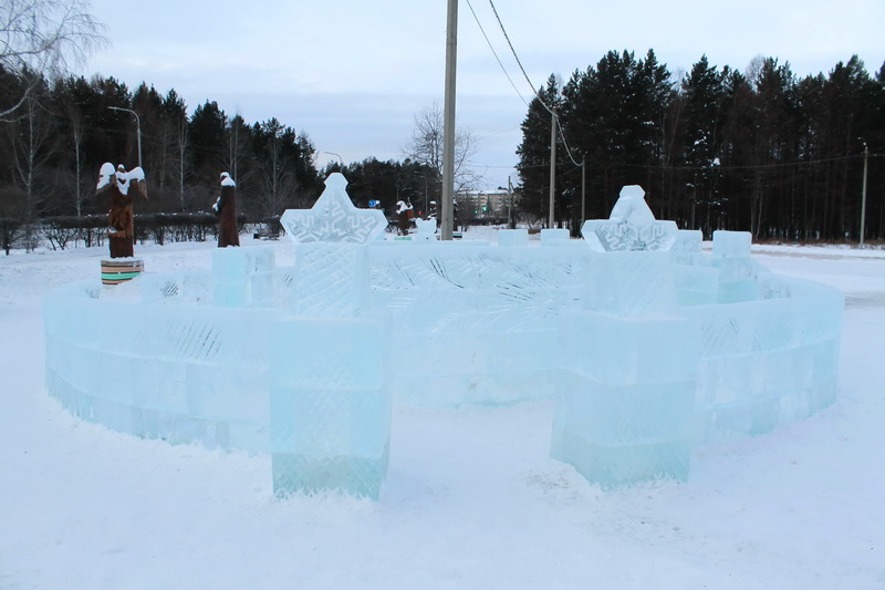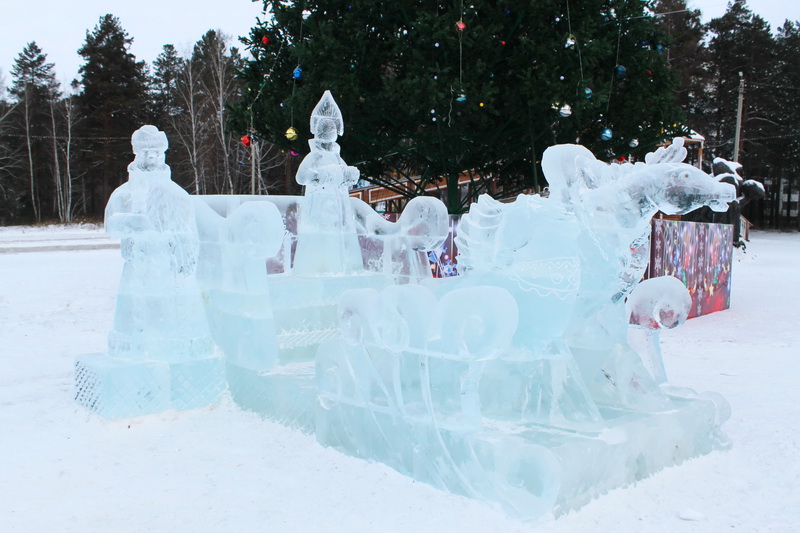 Тройка ледяных коней – декабрь, январь и февраль, добрый Дедушка Мороз и его внучка Снегурочка, ледяной лабиринт с горками для катания и символом наступающего года, столики кафе изо льда, фотозоны. Мастера создали красивую сказку из прозрачного льда. По вечерам городок и красавица-елка светятся праздничными огнями. Дети и взрослые приходят сюда, чтобы прокатиться на горке, сфотографироваться.