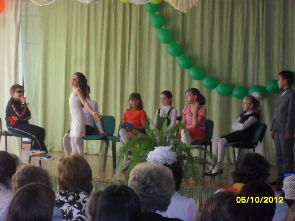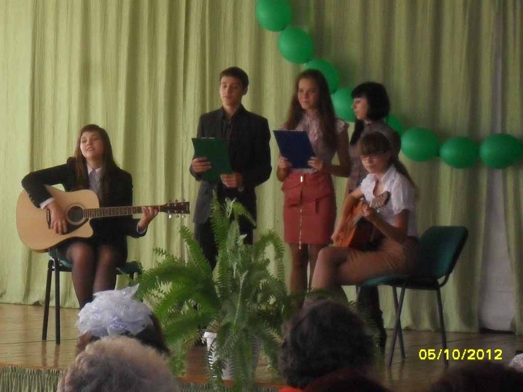 Ученики школы, как полагается, тоже не оставили педагогов без внимания, порадовав весёлыми сценками, песнями под гитару и конкурсами для учителей.