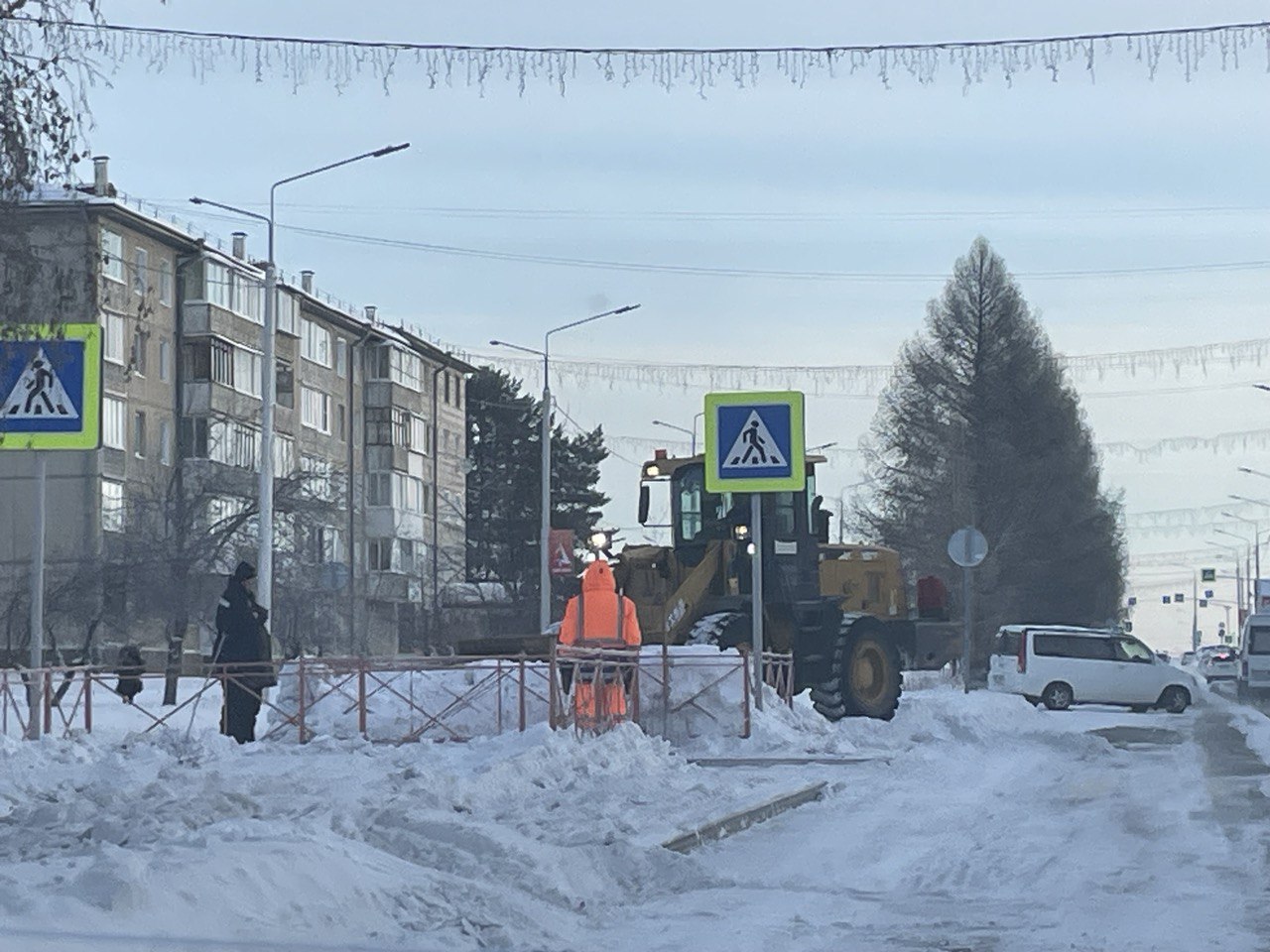 - вывоз снега на улице Советской,начиная от «Рябинушки». Работают погрузчик, МАЗ, КамАЗ.