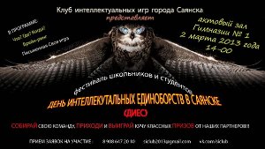 пройдёт Фестиваль «День интеллектуальных единоборств в Саянске». К участию в Фестивале интеллектуальных игр приглашаются сборные команды школ, учреждений дополнительного образования, общественных организаций, профессиональных училищ и лицеев, колледжей и техникумов (команда и её руководитель). Учредителем мероприятия является Клуб интеллектуальных игр города Саянска, а организаторами — инициативная группа молодежи и Некоммерческое партнерство «Центр коммуникации «Саянцы.ру».