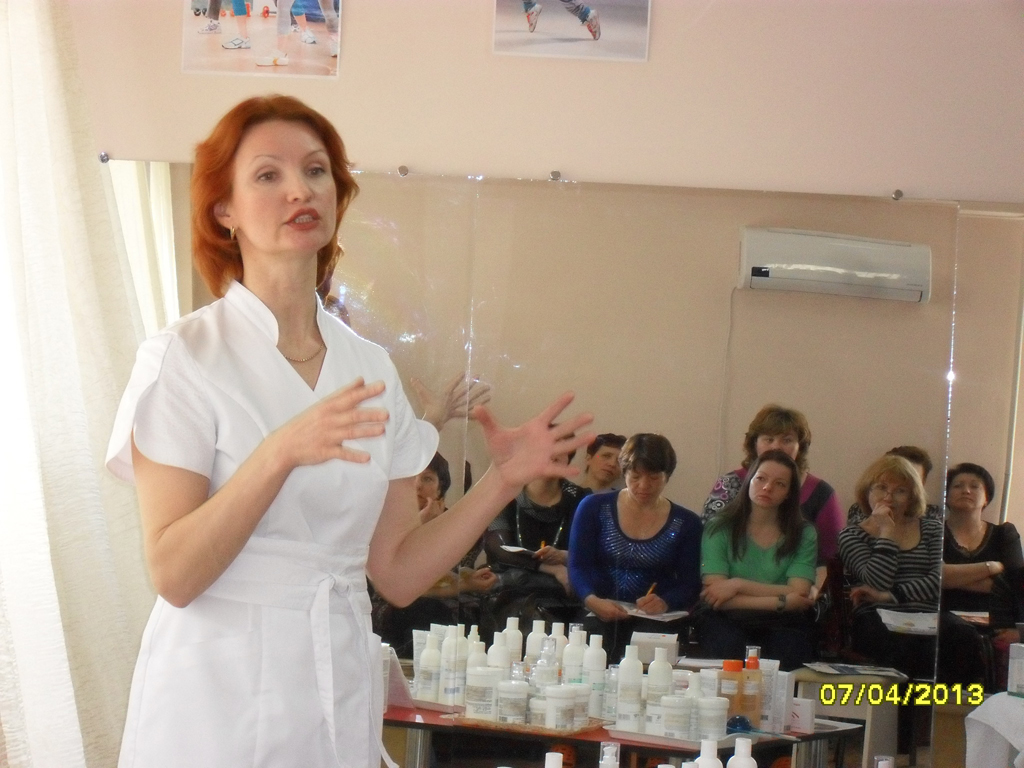 Затем косметологи рассказали линиях профессиональной косметики, с которой работают в салоне, попутно отвечая на вопросы аудитории. Самый большой интерес вызвала демонстрация возможностей аппаратной косметологии. Модели из аудитории нашлись мгновенно. Лифтинговый эффект аппарата LPG вызвал восторженные возгласы. При «работе» по лицу модели в течение всего нескольких минут стала отчётливо видно, как подтянулись мышцы лица, а ведь салонная процедура длится почти час!