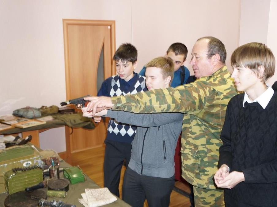 Затем состоялась презентация отечественного и иностранного оружия и обмундирования разных лет, разных видов войск. В заключение ребятам предоставили возможность пострелять из лазерного пистолета «Макаров» по мишени.
