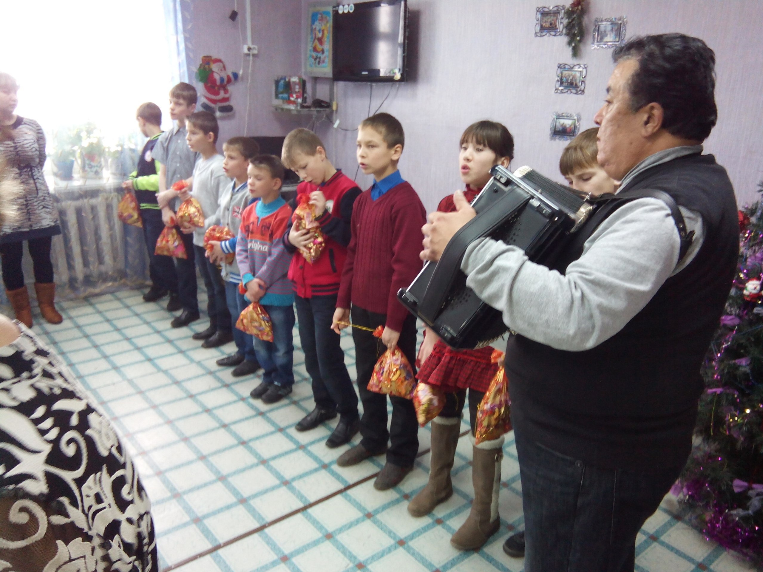 Под Новый год сбор был еще не окончен, и потому саянцы решили подарить игрушки детям под Рождество. Было решено отвезти подарки в Специальную коррекционную школу-интернат №6 города Зима, где в тот день состоялся настоящий праздничный концерт, подготовленный воспитанниками школы. Праздничное мероприятие посетили и служители церкви, которые тоже прибыли к детям не с пустыми руками – они вручили сладкие подарки, помощь в приобретении которых оказал Денис Шлыков.