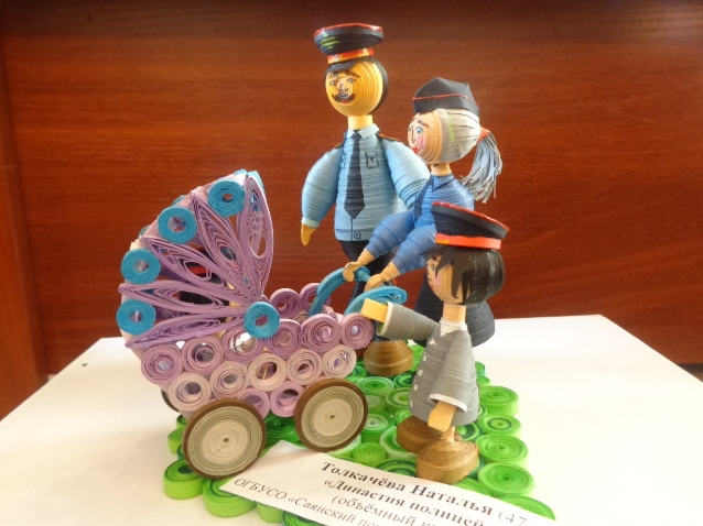 Куклы в рамках конкурса «Дядя Степа полицейский» выполнены из разных материалов – тряпичные, из шерсти в техники валяния, из глины, слоеного теста, дерева, воздушных шаров, вязаные. Одна из работ выполнена из бумаги в технике объемного квиллинга – это «Династия полицейских». Хотелось бы отметить еще одну из работ: она отличается тем, что «Дядя Степа» в спортивной форме, и у него имеется прототип – участковый уполномоченный полиции Владимир Дмитриевич Онегов. Со слов ребят, которые посещают детский клуб «Пилигрим», где находится также опорный пункт полиции участкового Онегова В.Д., именно таким они и видят полицейского, который и вежлив, и станет на защиту любого, кто нуждается в помощи.