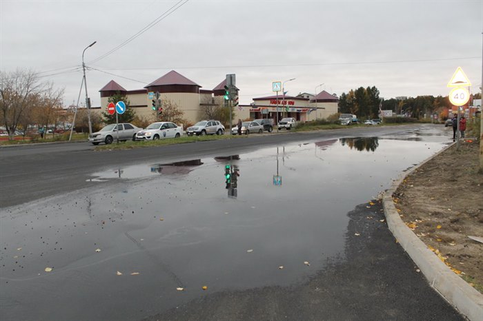 На перекрестке с проспектом Ленинградским в районе магазина «Подарки» всегда было «больное место» – яма, в которой после дождей стояла лужа. «После укладки нового асфальта возникли сомнения, что эта неровность осталась», – говорит мэр. Было решено проверить это старым дедовским способом – проблемный участок пролили водой. Сомнения мэра подтвердились. Лужа хоть и меньших размеров, но осталась.