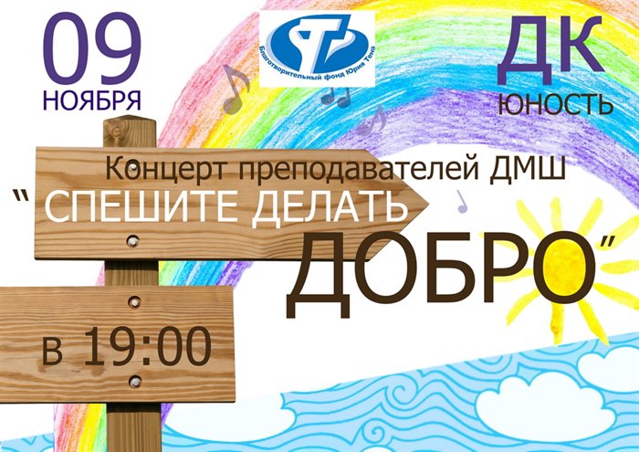 Концертная программа «Спешите делать добро» начнется в 19 часов 9 ноября, обещает быть интересной, поэтому мы приглашаем в ДК «Юность» всех, кто любит красивую музыку, чьи сердца открыты добру и радости!