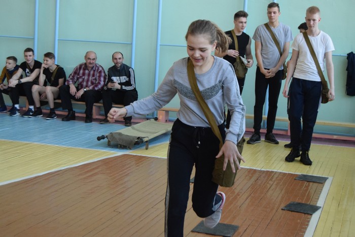 Итак, в седьмой школе стартовал первый этап игры, и, пожалуй, самый сложный − военно-спортивная эстафета. Семь команд в составе которых было по три девушки и семь юношей на время надевали противогазы, преодолевали «мышеловку», собирали и разбирали автоматы, транспортировали «раненых». За каждое нарушение правил игры участникам начислялись штрафные баллы. Победитель здесь определялся по лучшему времени преодоления испытаний и наименьшим штрафным очкам.