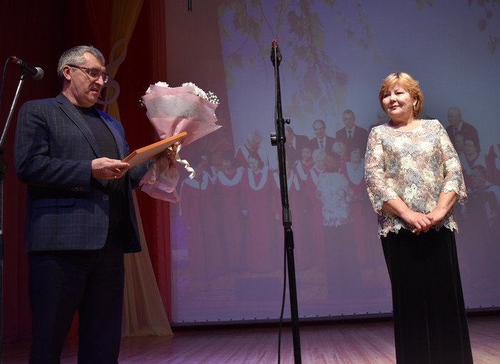 Гостей Дворца культуры в холле встречала духовая музыка в исполнении детского коллектива «Дилижанс». Вели программу режиссеры массовых представлений Ирина Внукова, Марина Вологдина, Антон Григорьев, Виктор Воронков. А открыл концерт самый заслуженный и самый многочисленный коллектив – хор ветеранов «Надежда». Заместитель мэра города Александр Ермаков приветствовал зрителей и артистов, вручил благодарность мэра концертмейстеру хора Надежде Никитушкиной.