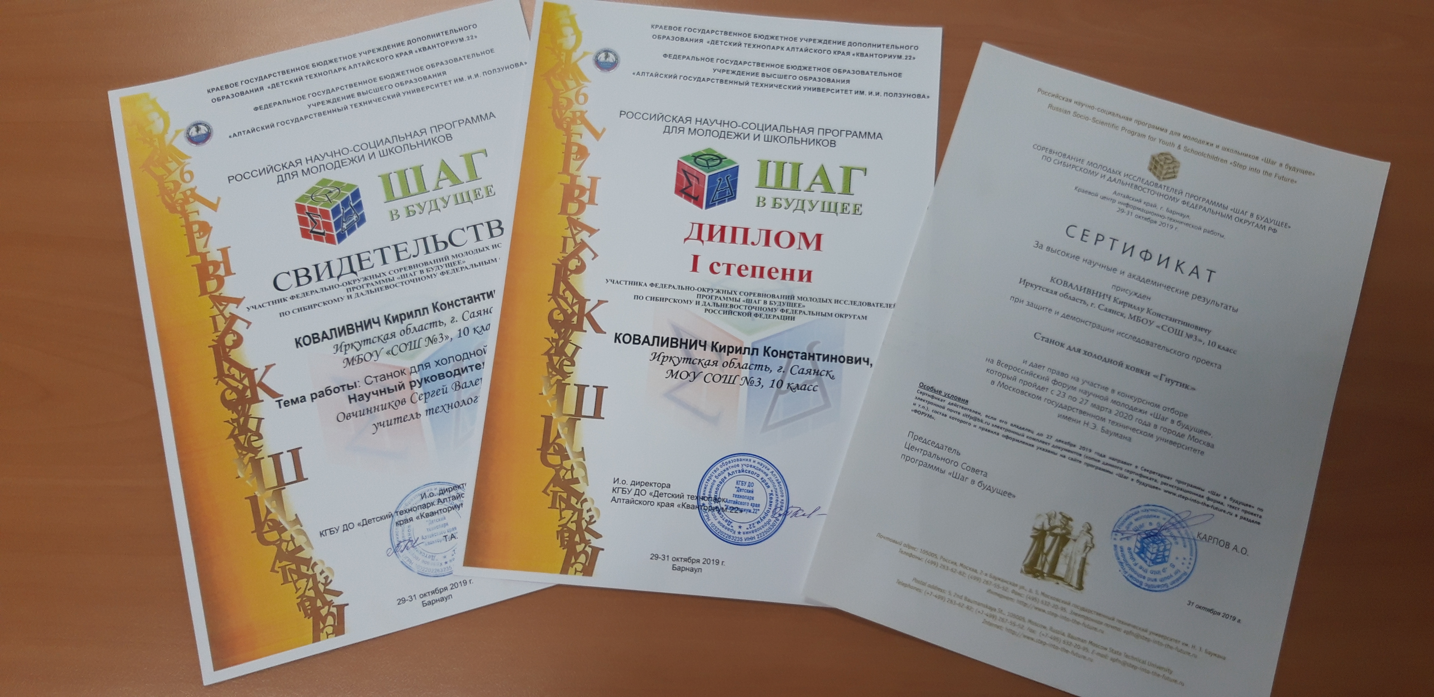 От города Саянска заявку на участие подал Кирилл Коваливнич, ученик школы № 3 с работой «Станок для холодной ковки «Гнутик», руководитель Сергей Валерьевич Овчинников.