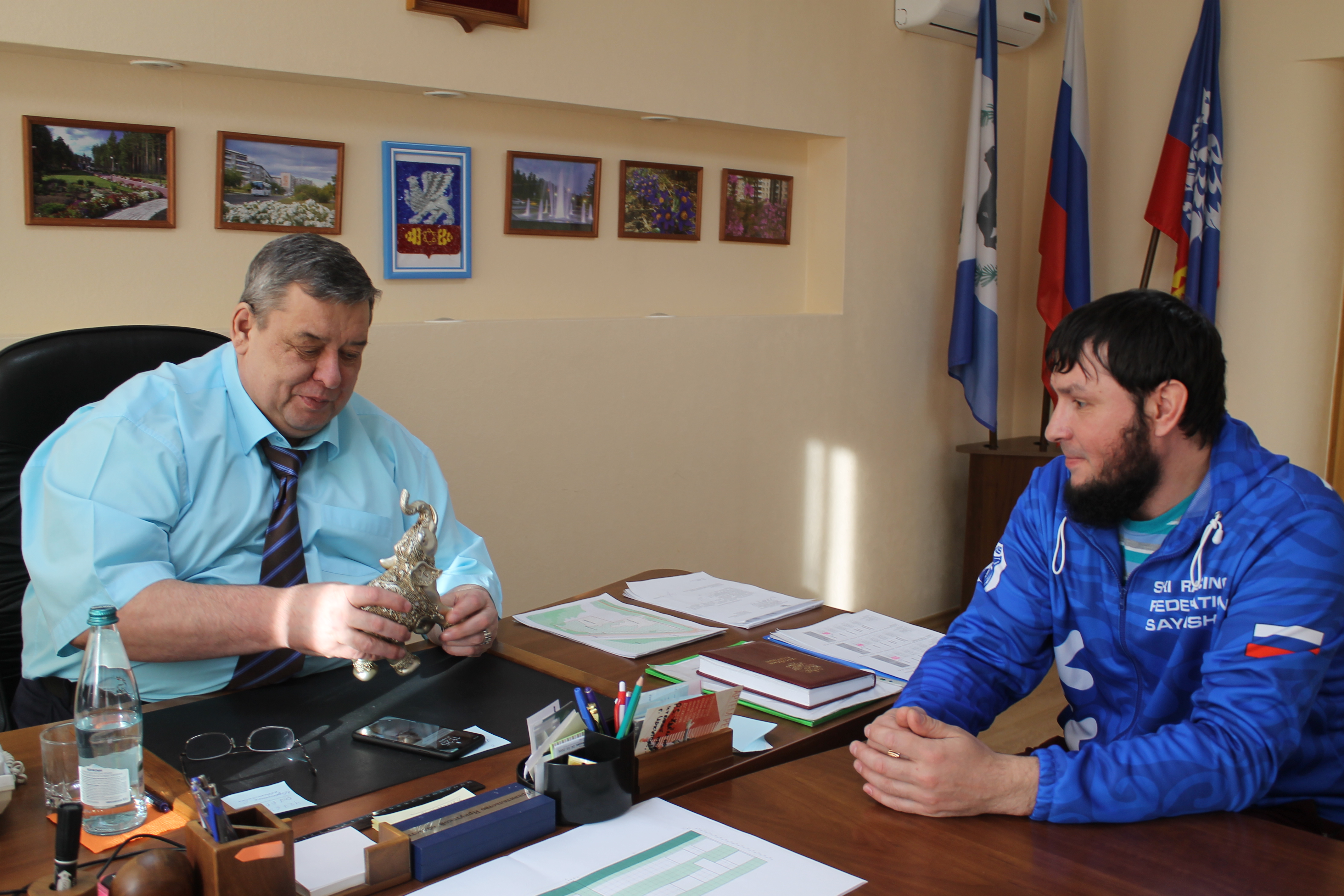 На приеме у Олега Боровского побывал тренер по лыжным гонкам спортивной школы города Саянска Михаил Асташев. Он поблагодарил мэра за вклад в развитие этого вида спорта и подарил фигурку слона, которого привез из дацана в Улан-Удэ, где саянцы принимали участие в матчевой встрече по лыжным гонкам среди юношеских сборных команд Иркутской области, Бурятии и Забайкальского края.