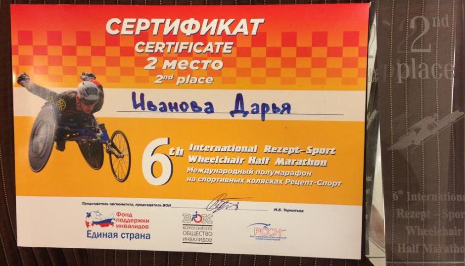 Саянская спортсменка Дарья Иванова выиграла серебряную медаль на VI Международном полумарафоне на спортивных колясках «Рецепт-Спорт», который состоялся 23 октября на трассе «Сочи Автодром». В соревнованиях принимали участие 16 человек, из них 11 членов сборной команды России по паралимпийским видам спорта, – сообщается на сайте министерства спорта Иркутской области.
