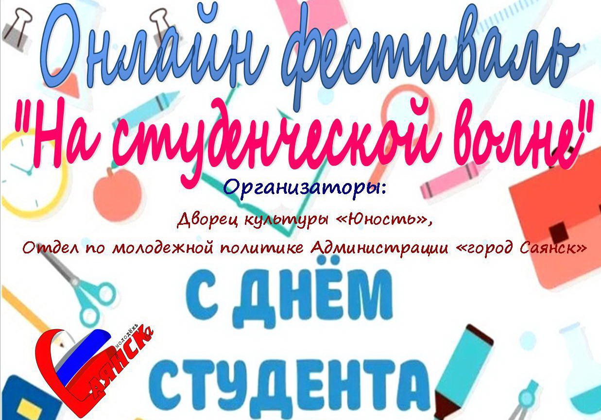 Дворец культуры "Юность" и отдел по молодежной политике администрации города Саянска приглашают студентов принять участие в онлайн-флешмобе "На студенческой волне",приуроченного ко Дню студента.