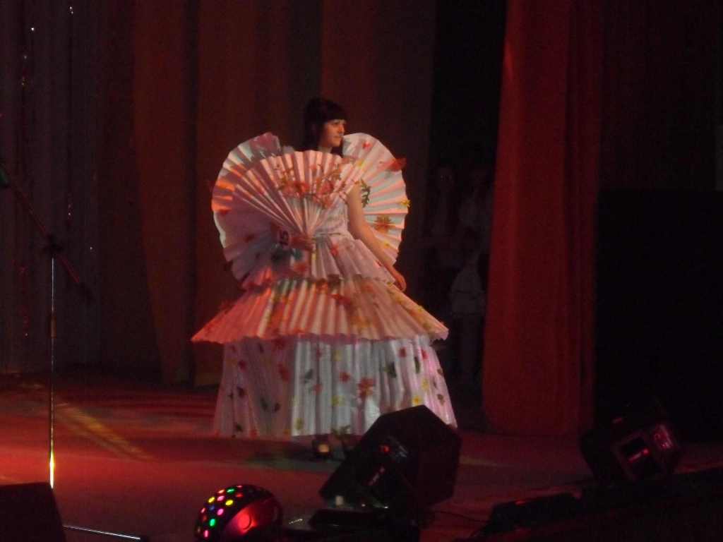 Следующим этапом конкурсантки продемонстрировали платья собственного дизайна на осеннюю, конечно, тему. Здесь девушки дали волю своей фантазии. Платья из гофрированной бумаги, тетрадных листов, обоев, пакетов, кассетной ленты и осенних листьев, такого разнообразия материалов не встретишь на настоящих подиумах.