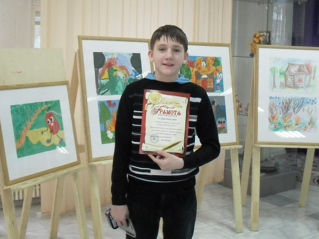 Сорок шесть учащихся детской художественной школы приняли участие в первом этапе конкурса рисунков, посвященных 130-летию Иркутского областного отделения Всероссийского добровольного пожарного общества. После подведения итогов лучшие работы были отправлены в Иркутск. Их авторы отмечены дипломами и ценными призами. Награды юным художникам вручил руководитель местного отделения ВДПО А.В.Власюк. Он сообщил о результатах регионального этапа всероссийской олимпиады школьников по «Основам безопасности жизнедеятельности» - она прошла 20-21 января на базе Иркутского Государственного Лингвистического Университета. Его участниками стали 89 старшеклассников из 15 городов Иркутской области. У всех ребят была возможность проявить себя, показать все свои умения и знания при выполнении теоретических и практических заданий. В секции «Действия в чрезвычайной ситуации» Иркутским Областным Отделением «ВДПО» была выставлена пожарная эстафета «Тушение условного очага пожара от внутреннего пожарного крана». Участникам нужно было правильно выбрать тип пожарного рукава, ствол, проложить рукавную линию до очага загорания, открыть вентиль пожарного крана, вернуться к месту загорания, открыть на стволе кран подачи воды, имитируя тушение условного загорания. Задание выполнялось на скорость. Среди участников, показавших лучшее время – учащийся гимназии № 1 нашего города Александр Белов. Ему для прохождения этапа понадобилось 32, 58 сек. – это второй результат среди девятиклассников. В феврале ВДПО намерено провести конкур поделок. Работы уже готовятся.