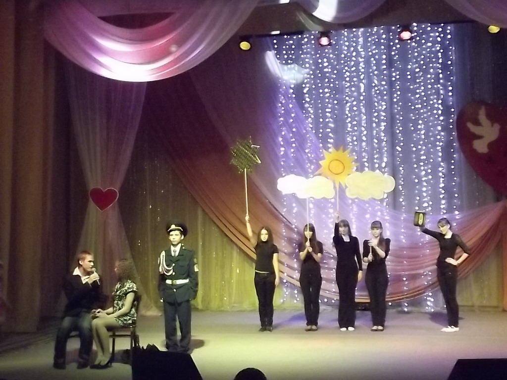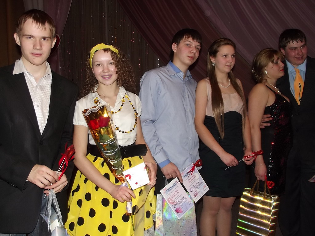 «Влюбленные творят чудеса: если преподносят цветы, то – миллион роз; если дарят подарок, то – звезду с неба; если признаются в любви, то – на весь белый свет», – сказали, открывая конкурсную программу, ведущие. И все участники, в подтверждение этих слов, оказались на высоте своего чувства. Им предстояло выполнить три конкурсных задания: рассказать о знакомстве, сделать признание в любви и совершить перевоплощение, примерив новый образ. На последнем этапе влюбленные выступили в образе литературных персонажей, первобытных людей и киногероев. Выступление оценивало жюри. Строгие судьи отметили искренность всех участников и, особо, прекрасную подготовку гимназистов, театральные инсценировки которых отличались выразительностью и остроумием. А вот победителями конкурса признаны студенты медицинского училища Николай и Наталья Пакусины.