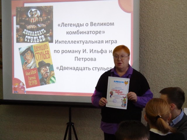 В середине декабря в Детской библиотеке Саянска прошли интеллектуальные игры для учащихся 6-х и 9-х классов школ города. Девятиклассники боролись за звание «Самого умного класса» в игре под названием «Легенда о Великом комбинаторе». Задания составлялись по роману Ильи Ильфа и Евгения Петрова «12 стульев». Всего было пять туров, в каждом по семь вопросов.