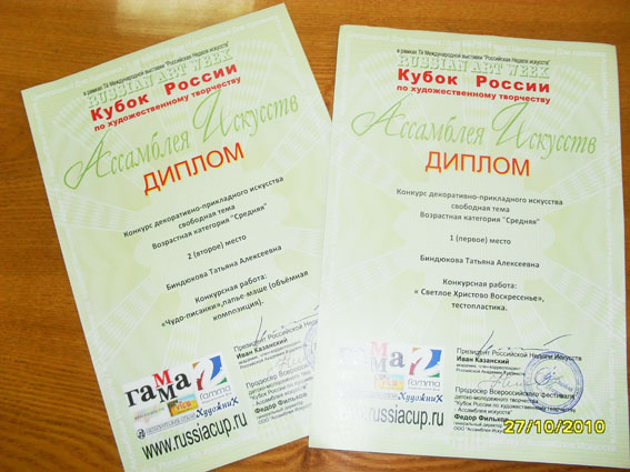 На Всероссийском детско-молодежном фестивале искусств тринадцатилетняя Саяночка Татьяна Биндюкова заняла первое место. Таня занимается в объединении «Старт-дизайн» в доме детского творчества «Созвездие» третий год, и начинала с городских выставок, в прошлом году она заняла первое место на областном уровне, и вот только что «взяла» первое место на Всероссийском уровне!!! Работа Тани называлась «Светлое Христово воскресенье» и была выполнена из стеклопластика, вторая работа «Чудо-писанки» сделана из папье-маше.