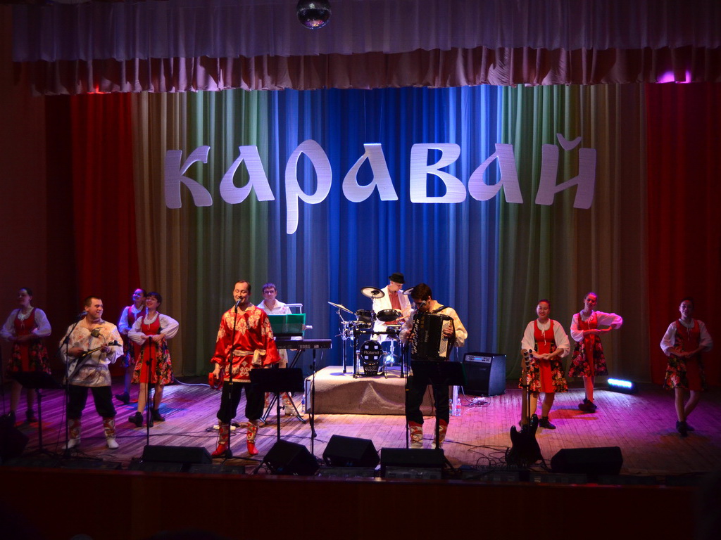 16 декабря в ДК «Юность» состоялся отчетный концерт вокально-инструментального ансамбля «Каравай». Коллектив вышел на сцену в ярких нарядных костюмах, выполненных в славянском стиле, и свое выступление начал с композиции «Соловей-соловушка». Воспитанницы студии современного танца «Квартал Дэнс» в русских народных платьях гармонично вписались в коллектив ансамбля — танцы девушек отлично украсили выступление «Каравая». Постепенно народные творческие номера ансамбля сменились на современные эстрадные песни — во время их исполнения зрительный зал подпевал солистам ансамбля, а по завершении каждого номера раздавались бурные аплодисменты и крики: «Браво!». Судя по всему, в кассе были проданы все билеты, ведь зрительный зал был полон.