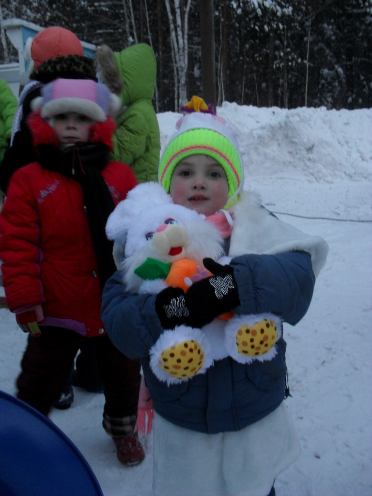 Очаровательной четырехлетней Нино Иремашвили за костюм пушистого зайчонка Хозяйка Ледяного городка вручила большую мягкую игрушку.