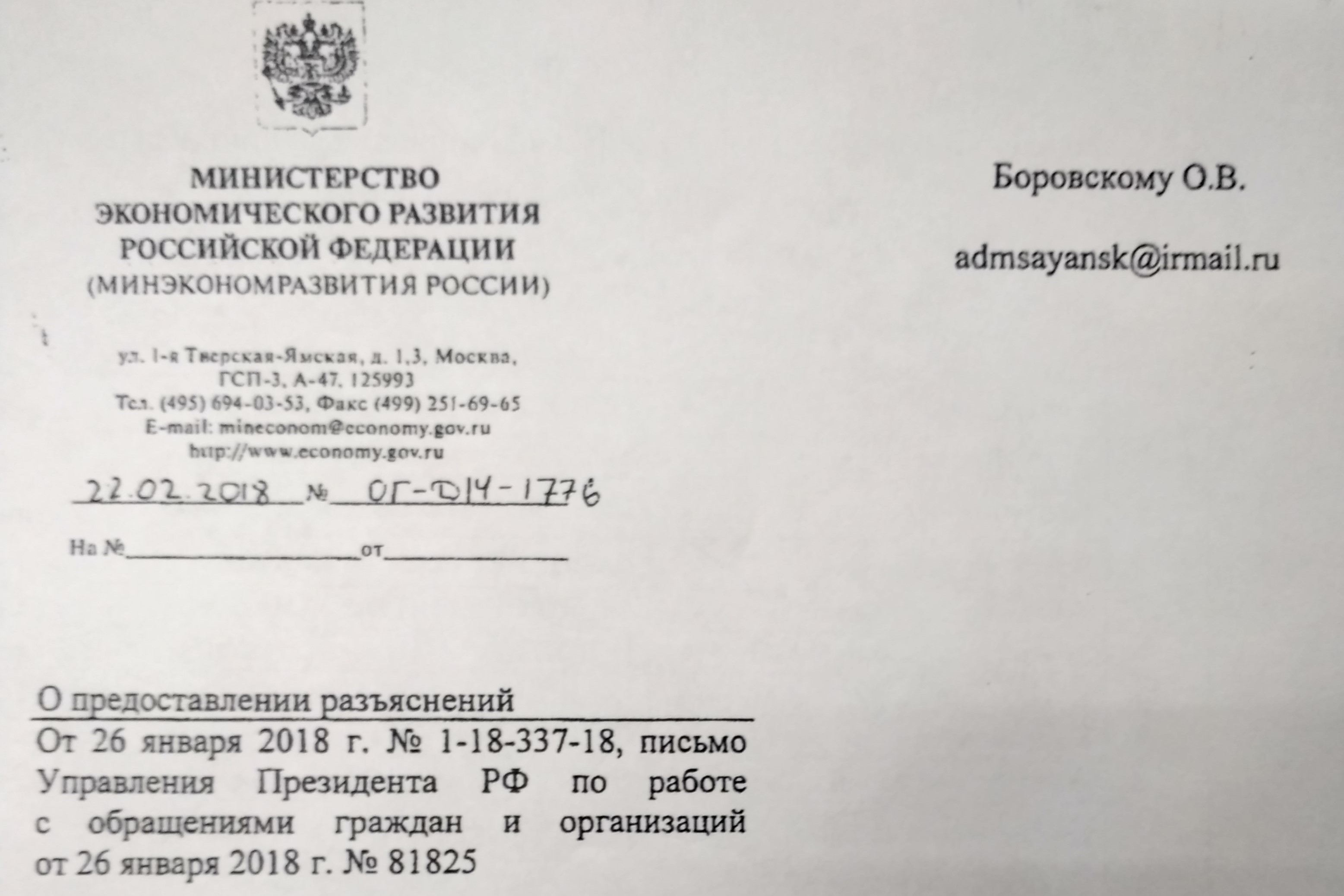 В адрес мэра города Саянска О.В.Боровского направлено письмо из Минэкономразвития РФ за подписью директора Департамента регионального развития И.В.Егорова, в котором говорится: «В соответствии с обращением по вопросу создания территории опережающего социально-экономического развития (ТОР) на территории моногорода Саянска Иркутской области Департамент регионального развития Минэкономразвития России сообщает, что проект постановления о создании ТОР «Саянск» внесен в Правительство Российской Федерации 21 февраля 2018 года.