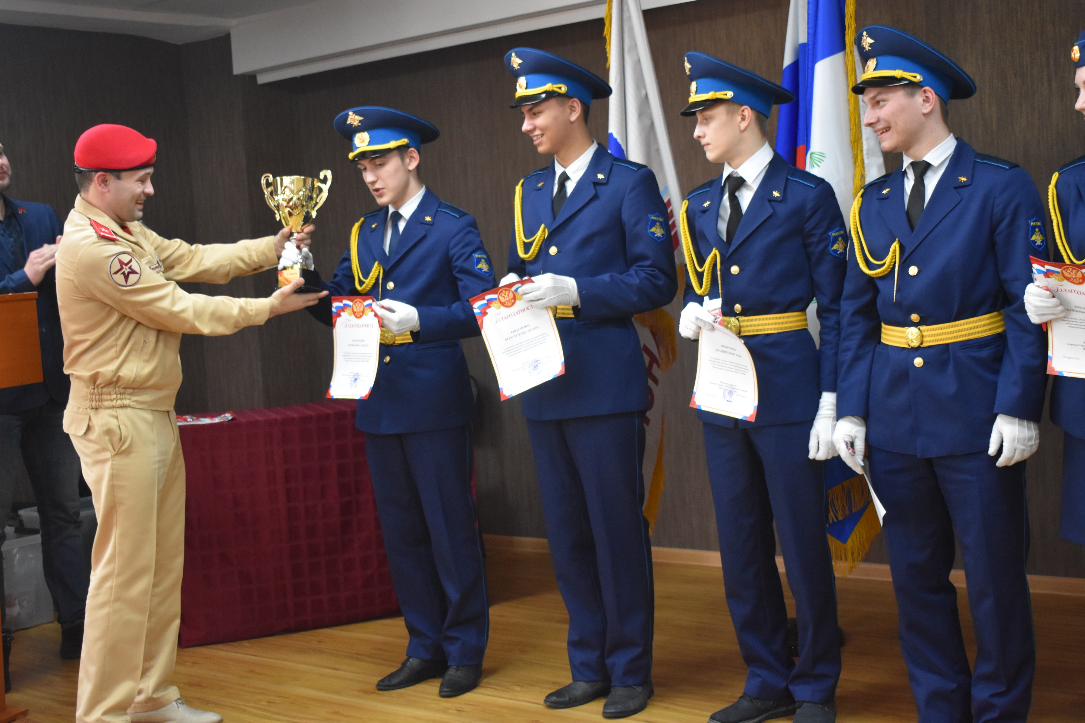 Ярким событием собрания стал торжественный прием в ряды юнармейского движения учащихся школы № 5. Воспитанники школьного военно-патриотического клуба, руководит которым педагог Михаил Костюкович, прочитали клятву юнармейца и получили из рук руководителей регионального штаба значки и планшеты с текстом клятвы. Отряд старшеклассников школы также вступил в ряды юнармии. Ученики школы № 3, принятые в движение на областном слете, также получили значки и кубок победителя тех соревнований.