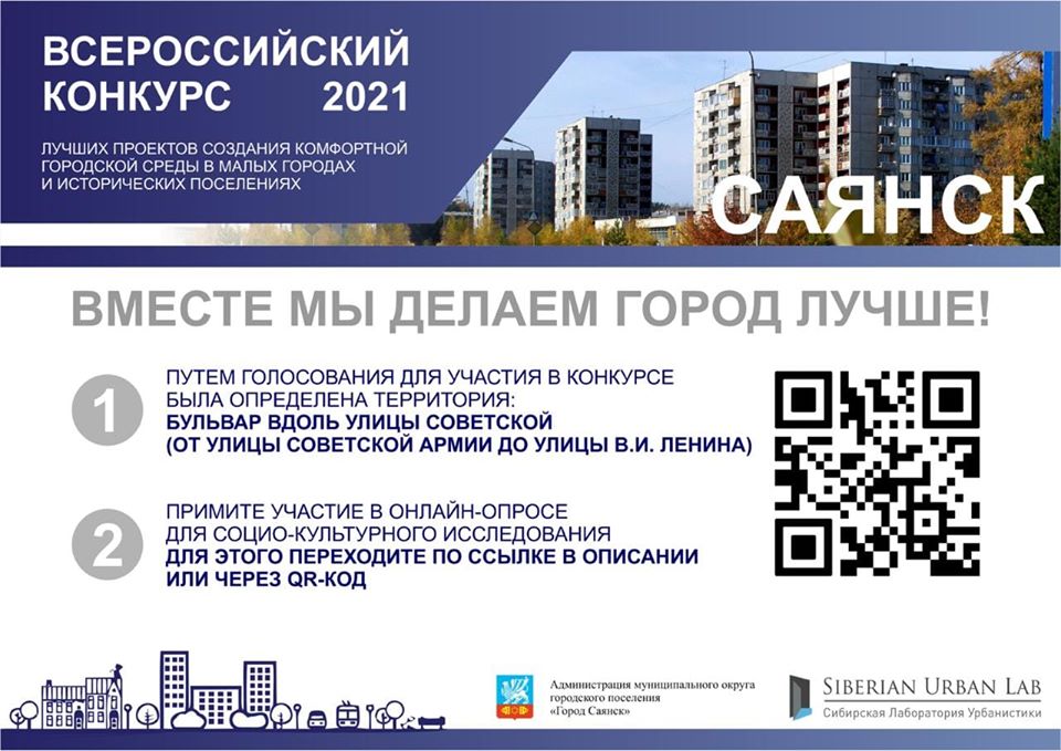Уважаемые саянцы! Уже несколько лет в России проводится "Всероссийский конкурс лучших проектов создания комфортной городской среды для малых городов и исторических поселений" (https://konkurs.gorodsreda.ru/#about). Наш город уже не первый раз участвует в этом конкурсе. Мы, команда администрации города Саянска и Сибирская Лаборатория Урбанистики, приглашаем Вас принять участие в проекте. Городская среда – это прежде всего результат деятельности всех городских субъектов (администрации / бизнеса / активистов / жителей). Ваше активное участие позволит нам создать сильный проект, учитывающий максимум мнений, идей и предложений, живой и объединяющий жителей.